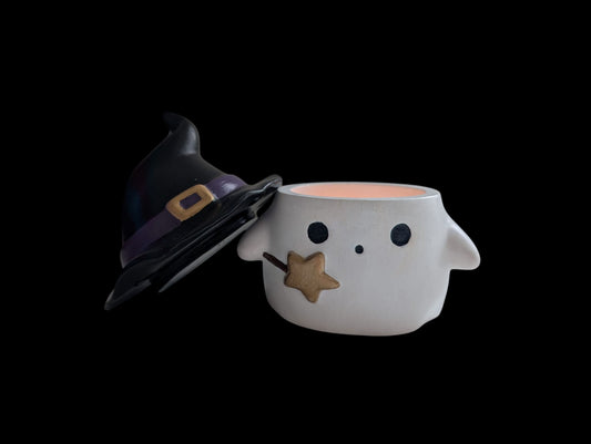 Handgemaakt spookje Potje met Heksenhoed – Magisch Bewaarpotje / Waxinelichthouder – Halloween Decoratie
