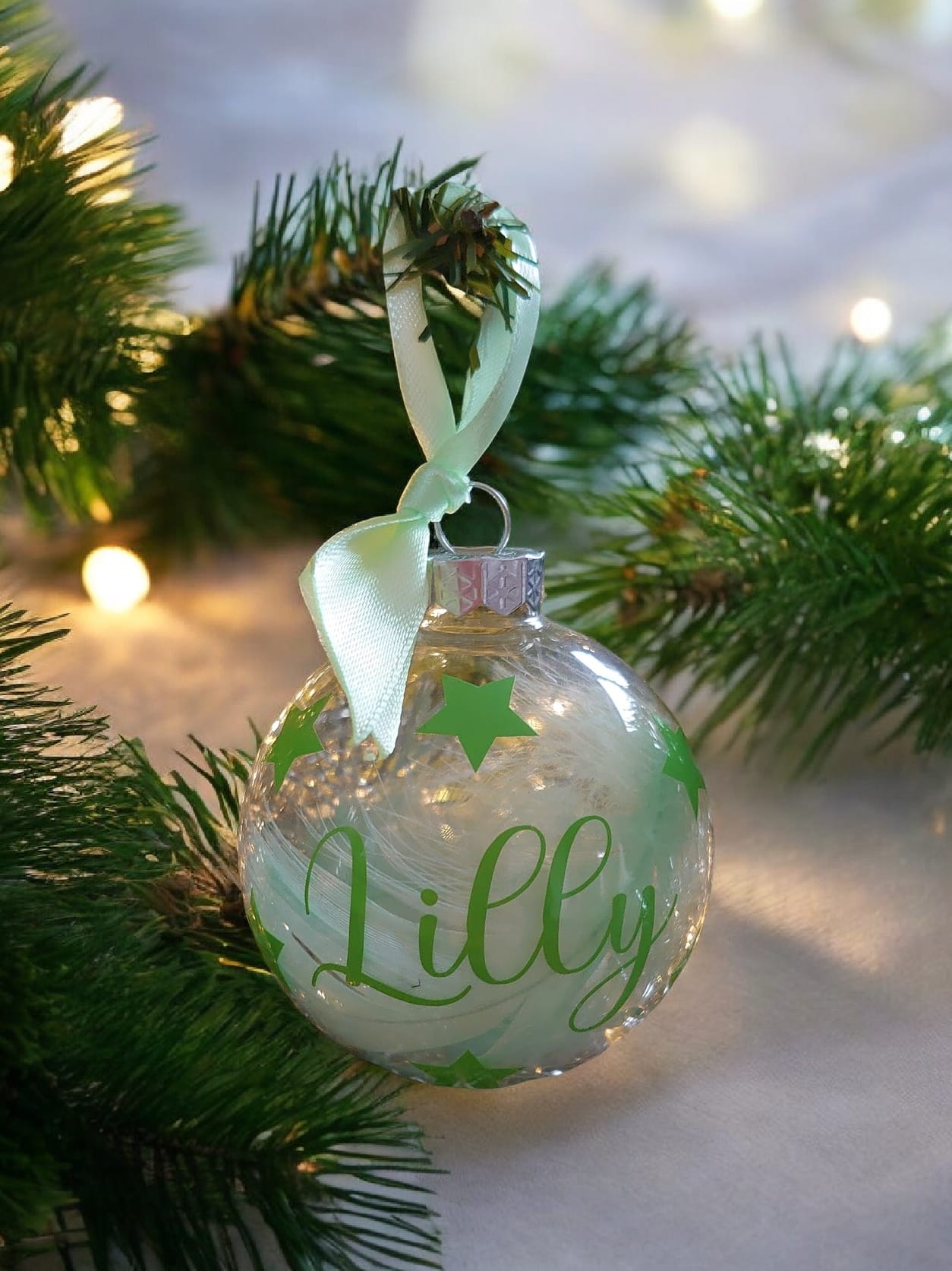 Maak de feestdagen magisch met deze prachtige glazen kerstbal, subtiel bedrukt met een sterrenhemel en gepersonaliseerd met jouw eigen naam. Met een zachte veer aan de binnenzijde en een luxe afwerking is dit hét pronkstuk voor in de kerstboom of een hartverwarmend cadeau om weg te geven.