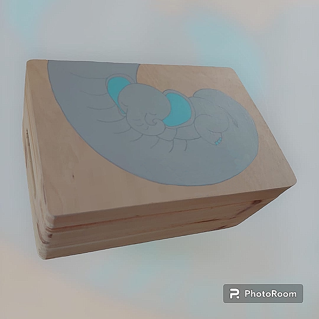 Bewaar de mooiste momenten van je kleintje in deze prachtige houten memory box. Met liefde beschilderd met een schattig slapend olifantje, veilig in de slurf van zijn mama. Een tijdloos en hartverwarmend ontwerp dat een glimlach op je gezicht tovert, elke keer dat je de box opent.